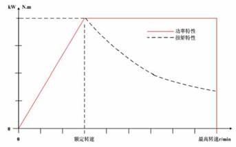 從零轉(zhuǎn)速至額定轉(zhuǎn)速為恒扭矩特性,額定轉(zhuǎn)速至最高轉(zhuǎn)速為恒功率特性